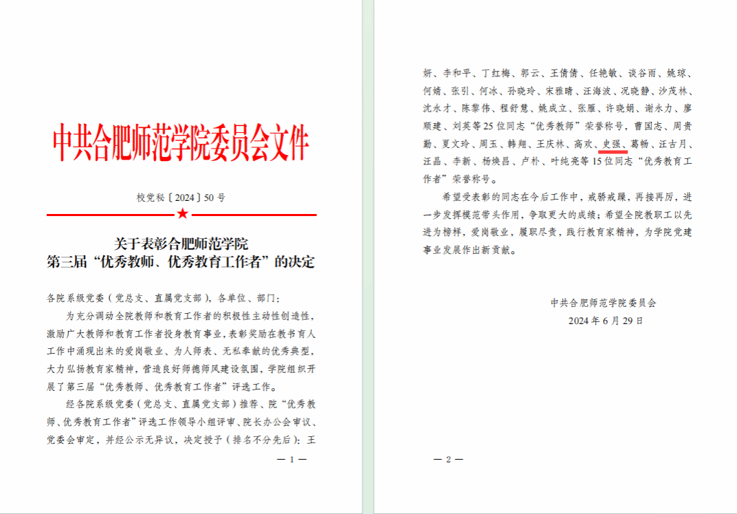 机关一党委办公室支部党员史强同志荣获学校2024年度“优秀教育工作者”荣誉称号。