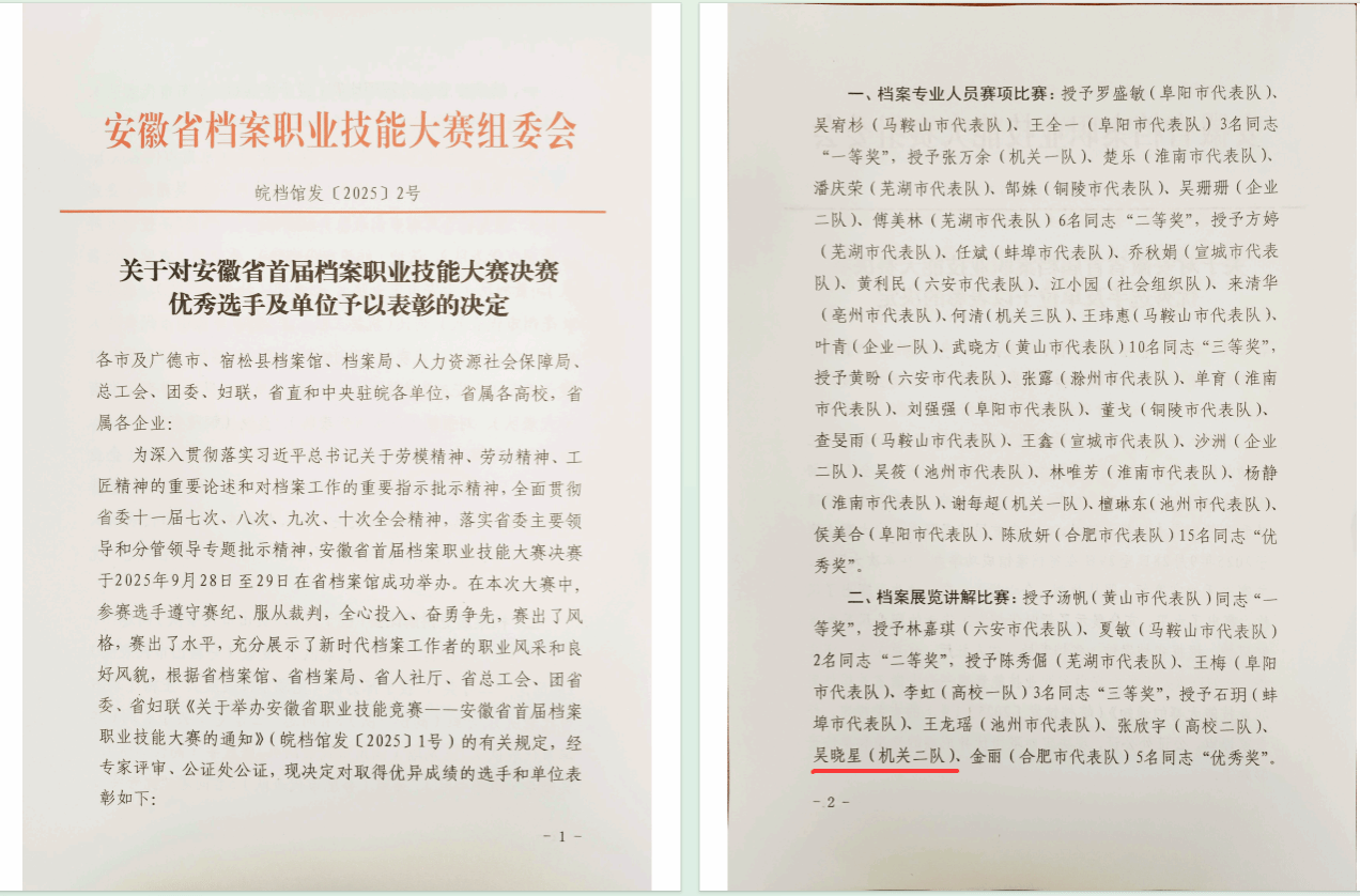 机关一党委办公室支部党员吴晓星同志荣获安徽省首届档案职业技能大赛优秀奖。